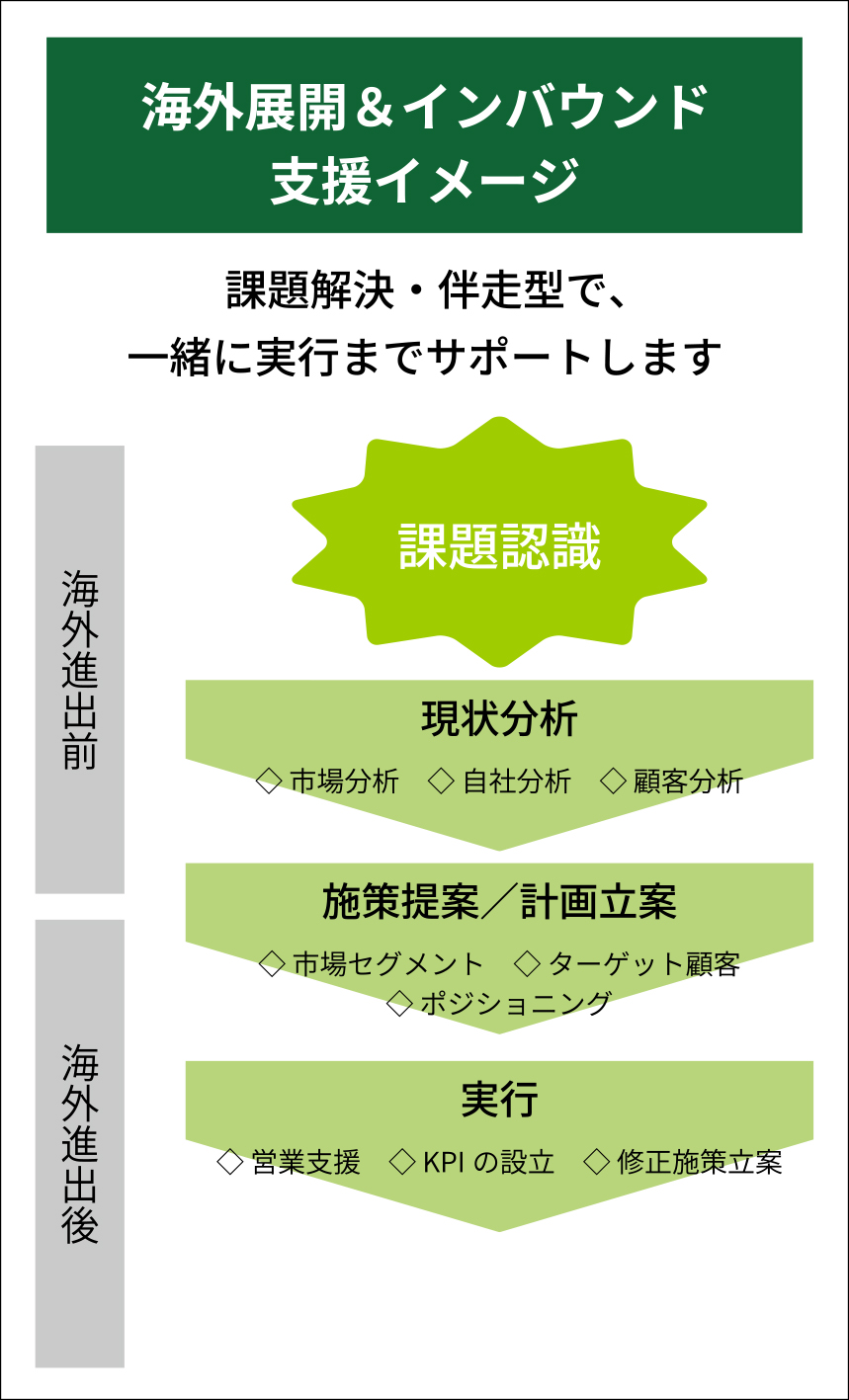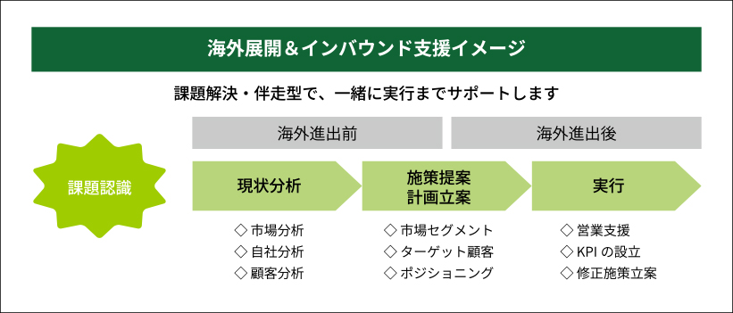 - 海外の市場及び顧客を分析しながら、最適な海外市場、顧客へのアプローチにについてご提案いたします。